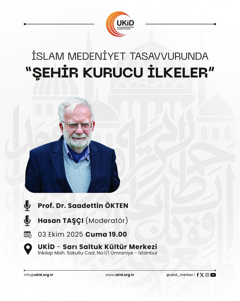 Kıymetli UKİD Dostları, 3 Ekim 2025 Cuma günü saat 19.00’da UKİD Sarı Saltuk Kültür Merkezimizde düzenleyeceğimiz “İslam Medeniyet Tasavvurunda ‘Şehir Kurucu İlkeler’” başlıklı sohbet programımıza teşriflerinizi bekleriz. Konuk: Prof. Dr.[…]