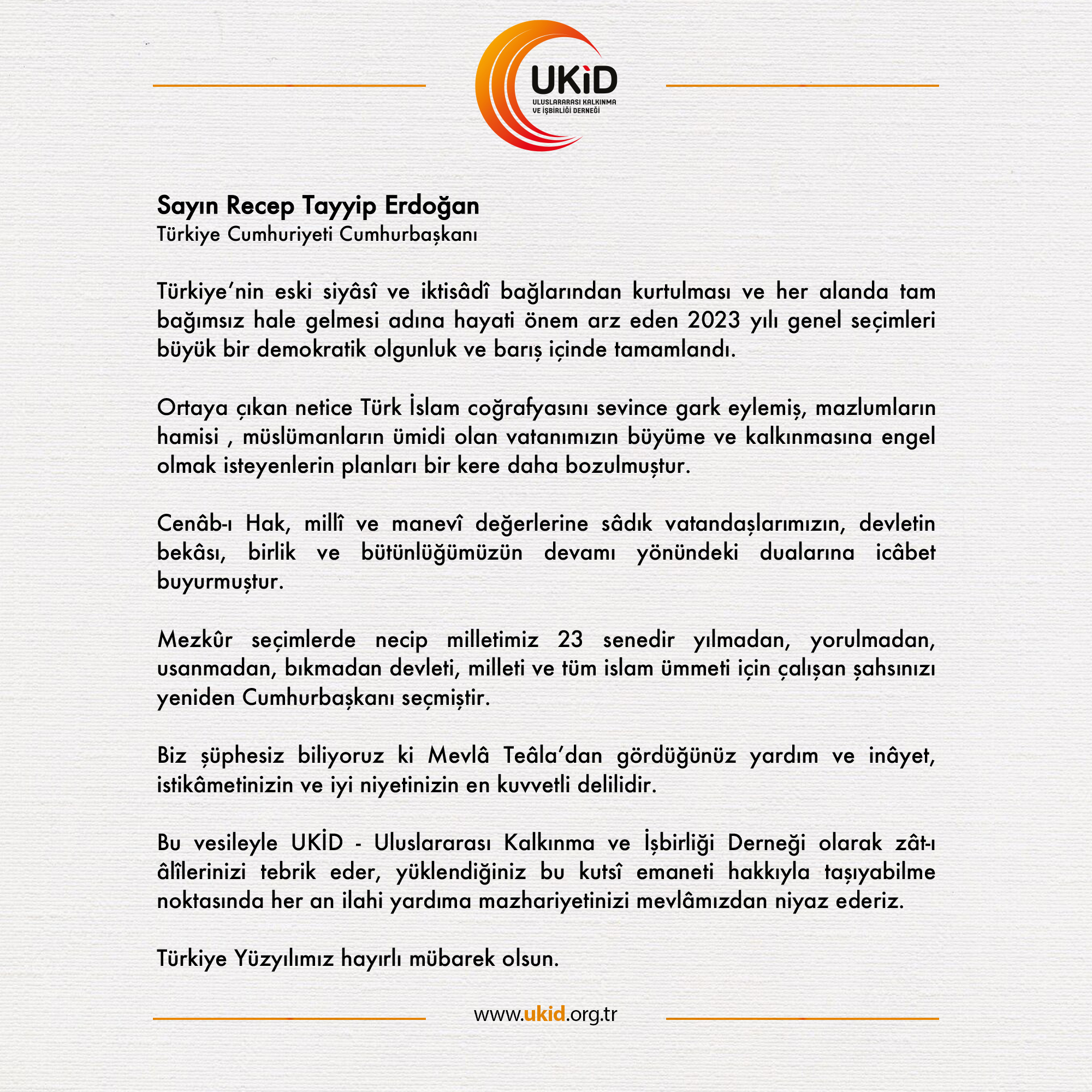 28 Mayıs 2023 Cumhurbaşkanlığı Seçimleri Neticesinde Tekrar Cumhurbaşkanı Seçilen Sayın Recep Tayyip Erdoğan’a Tebrik Mesajı