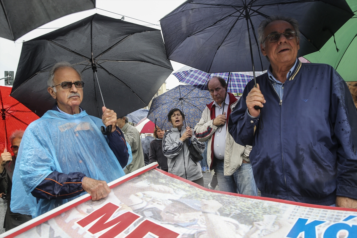 Çeşitli sendikaların çağrısıyla başkent Atina’daki Kotzia Meydanı’nda toplanan emekliler, yağan yağmura rağmen parlamento binasına yürüdü.